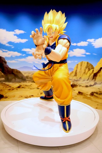 Entrez dans le magasin pour découvrir les nombreuses autres transformations de Goku ! Ici, on le voit avec le désert en arrière-plan, en position de combat et arborant une allure féroce sous sa forme de Super Saiyan !