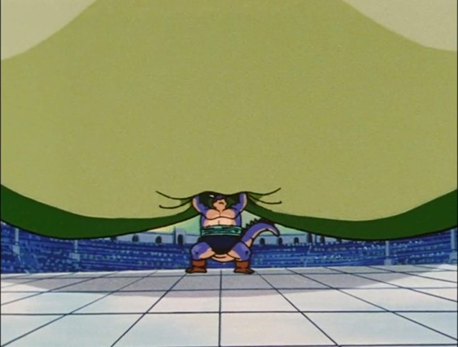 Après une gracieuse pirouette aérienne, il retombe sain et sauf au sol. Observant son adversaire bien plus imposant, il lance : « Tu trouves ça drôle d'être plus grand que moi, hein ? » Puis, dans un éclat de rire moqueur, il se met à gonfler son corps jusqu'à atteindre une taille gigantesque.