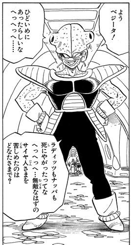 Ayant échappé de justesse à la mort sur Terre, Vegeta retourne sur la Planet Freeza No. 79, où Kiwi apparaît devant lui et lui lance d'un ton sarcastique : « Qui a bien pu tourmenter ainsi les Saiyans, soi-disant invincibles ? » Mais Vegeta l' ignore en lui disant : « Je n'ai pas de temps à perdre avec tes bavardages. »