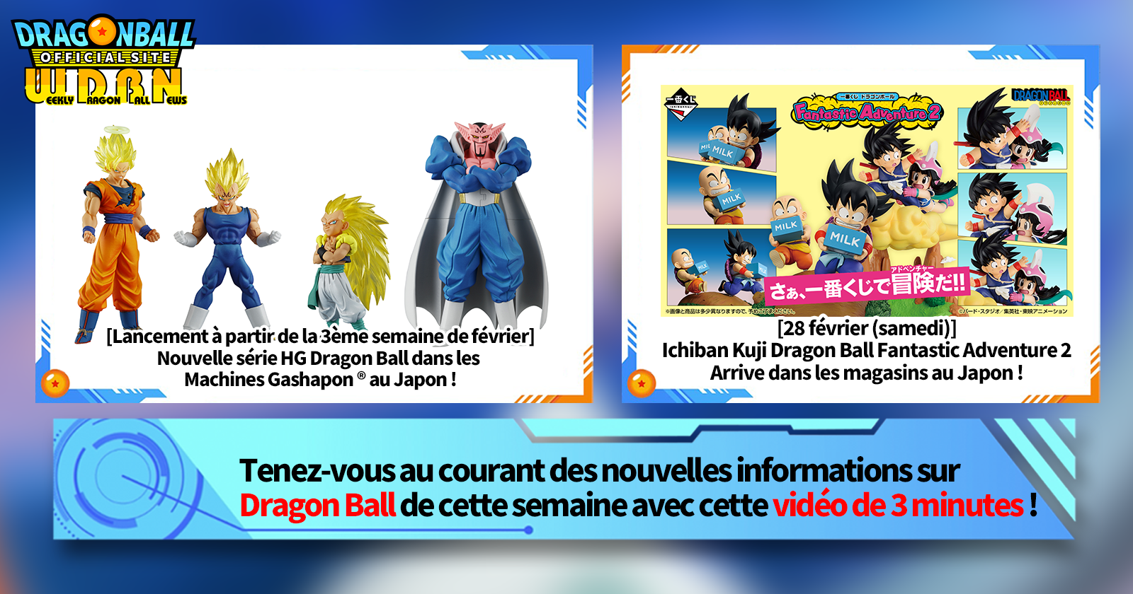 « Nouvelles hebdomadaires Dragon Ball» est une série vidéo mise à jour chaque lundi (heure japonaise) pour vous apporter les dernières nouvelles du monde de Dragon Ball! Retrouvez Victory Uchida, rédacteur en chef de V Jump , qui passe en revue toutes les informations les plus importantes de la semaine précédente, ainsi que les nouveautés comme les infos sur les nouveaux produits et les actualités du site pour la semaine à venir !