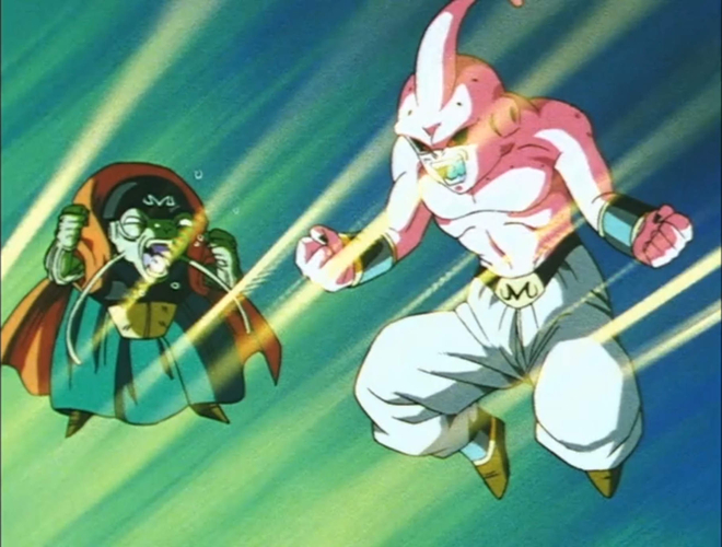Cependant, lorsque Buu absorbe le Great Supreme Kai, un être au tempérament doux et bienveillant, il se transforme en une version plus paisible de lui-même. Bibidi parvient à persuader ce Buu d'obéir grâce à son appétit vorace, en lui proposant : « À partir de maintenant, je te donnerai du gâteau tous les jours si tu m'obéis et fais ce que je te dis », ce à quoi Buu accepte sans hésiter.