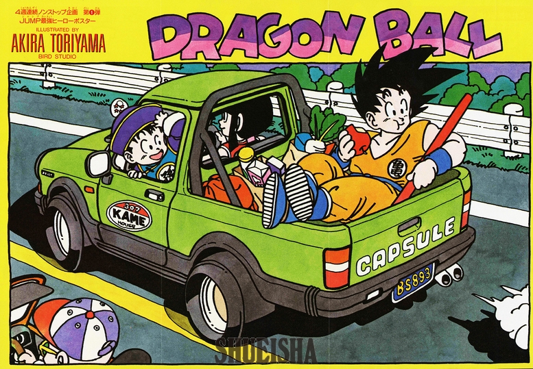 Cette illustration montre la famille Son en balade en voiture, le coffre du pick-up rempli de courses. Comme on pouvait s'y attendre, Goku mange nonchalamment une pomme, laissant le volant à Chichi.