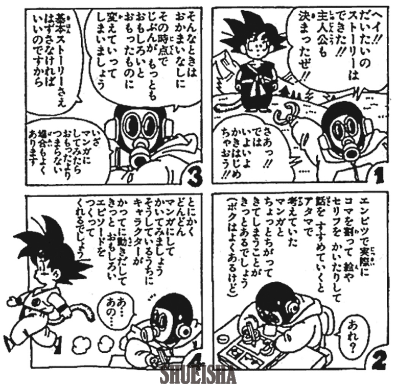 Akira Toriyama partage quelques conseils pour dessiner des mangas dans ce guide en quatre cases intitulé « Améliorez vos compétences en manga grâce à ce guide ! Les conseils de Toriyama pour Tenkaichi ! » Il conseille : « Commencez simplement à dessiner des mangas, et les personnages prendront vie d'eux-mêmes. Ils vous inspireront ensuite des histoires divertissantes. »
