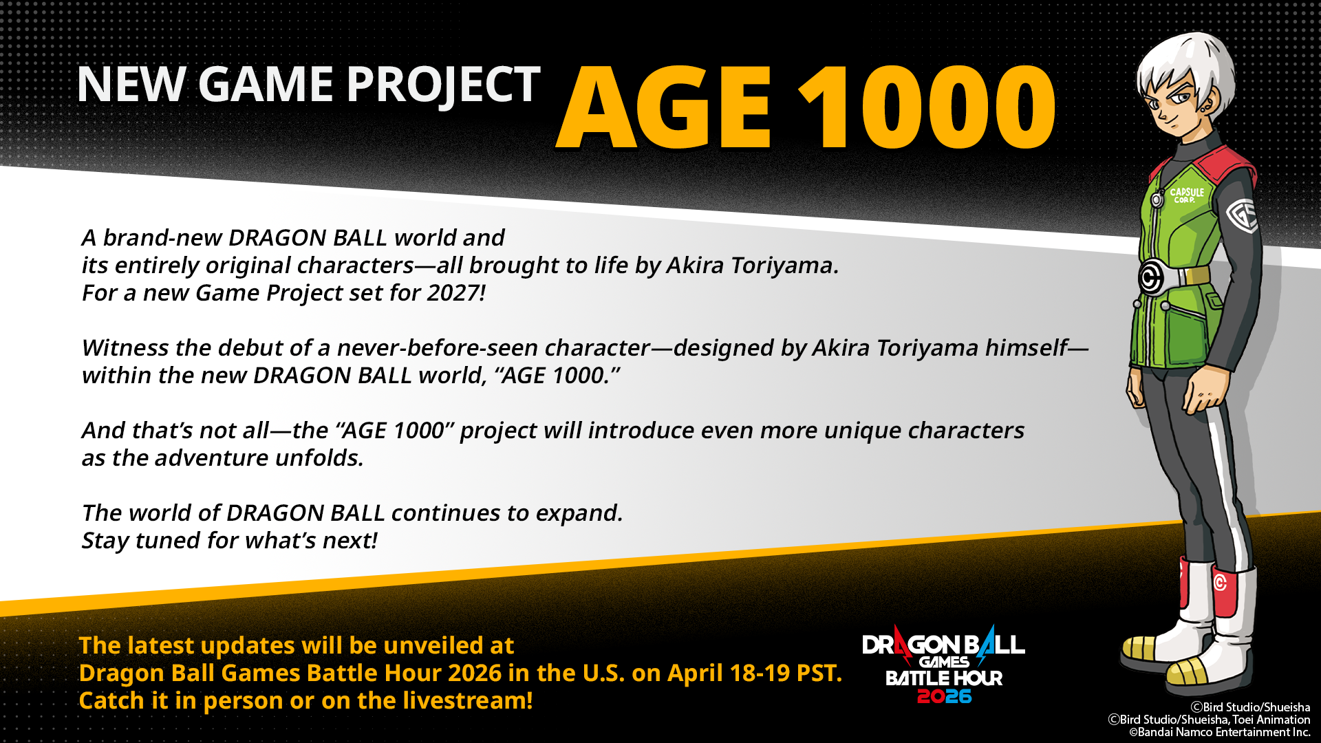 Les dernières informations concernant AGE 1000, un nouveau projet de jeu, seront dévoilées lors de l'événement Battle Hour Times ! Cet événement présentera également les dernières nouveautés des jeux Dragon Ball et bien plus encore !