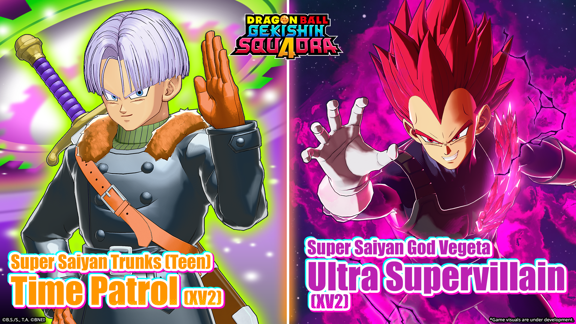 Trunks Super Saiyan (adolescent) et Vegeta Super Saiyan God , qui jouent également un rôle important dans DRAGON BALL XENOVERSE 2, recevront respectivement les skins Time Patrol et Super-Vilain Ultime dans DRAGON BALL GEKISHIN SQUADRA! Des emotes et des objets de personnalisation sont également prévus, alors restez connectés !