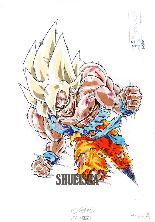 Cette illustration de Goku Super Saiyan est apparue en couverture du Weekly Shonen Jump, au beau milieu de l'épique bataille contre Frieza. En observant ce dessin, on perçoit clairement la détermination intense de Goku, la définition de ses muscles et des lignes de mouvement qui traduisent non seulement sa vitesse, mais aussi sa puissance brute.