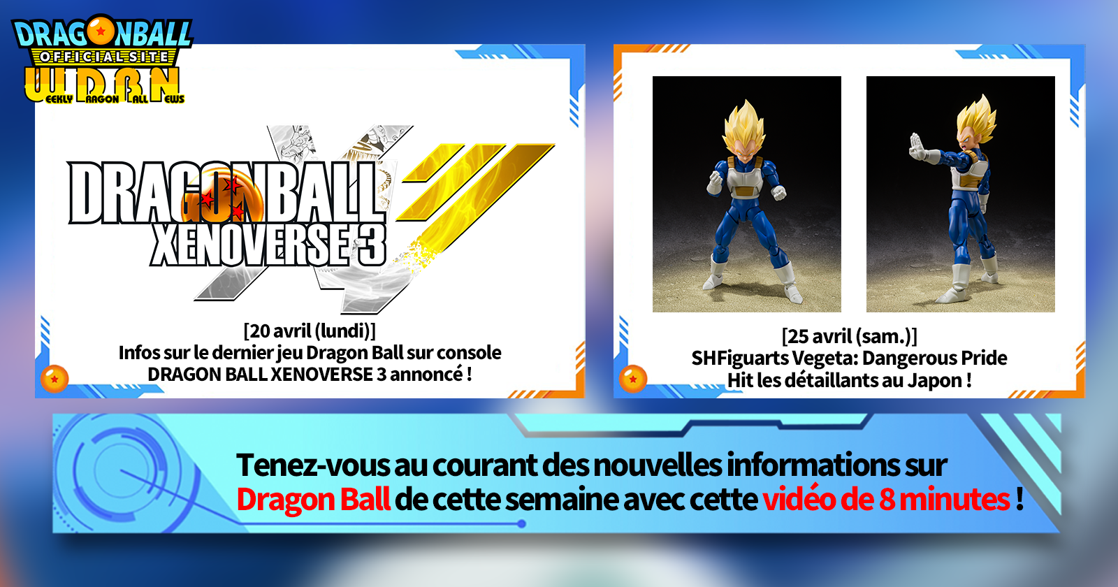 « Nouvelles hebdomadaires Dragon Ball» est une série vidéo mise à jour chaque lundi (heure japonaise) pour vous apporter les dernières nouvelles du monde de Dragon Ball! Retrouvez Victory Uchida, rédacteur en chef de V Jump , qui passe en revue toutes les informations les plus importantes de la semaine précédente, ainsi que les nouveautés comme les infos sur les nouveaux produits et les actualités du site pour la semaine à venir !