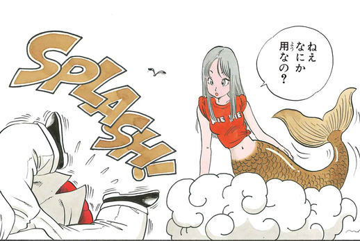 Cependant, la belle femme que Goku a trouvée était en fait une sirène ! Interloqué mais sans se Kamesennin , Kamesennin a essayé de devenir un peu trop maniable avec son nouvel invité et a fini par recevoir une bonne claque au visage pour se souvenir d'elle avant de replonger dans la mer.