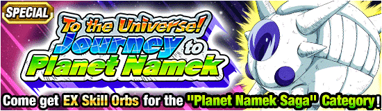 "Vers l'univers ! Voyage vers la Planet Namek " est lancé! Terminez toutes les missions qui seront progressivement publiées tout au long de cet événement pour obtenir des récompenses ! L'une des récompenses en vedette que vous pouvez gagner en accomplissant des missions est les orbes de compétence EX spécialement pour les personnages de la catégorie «Planet Namek Saga » !