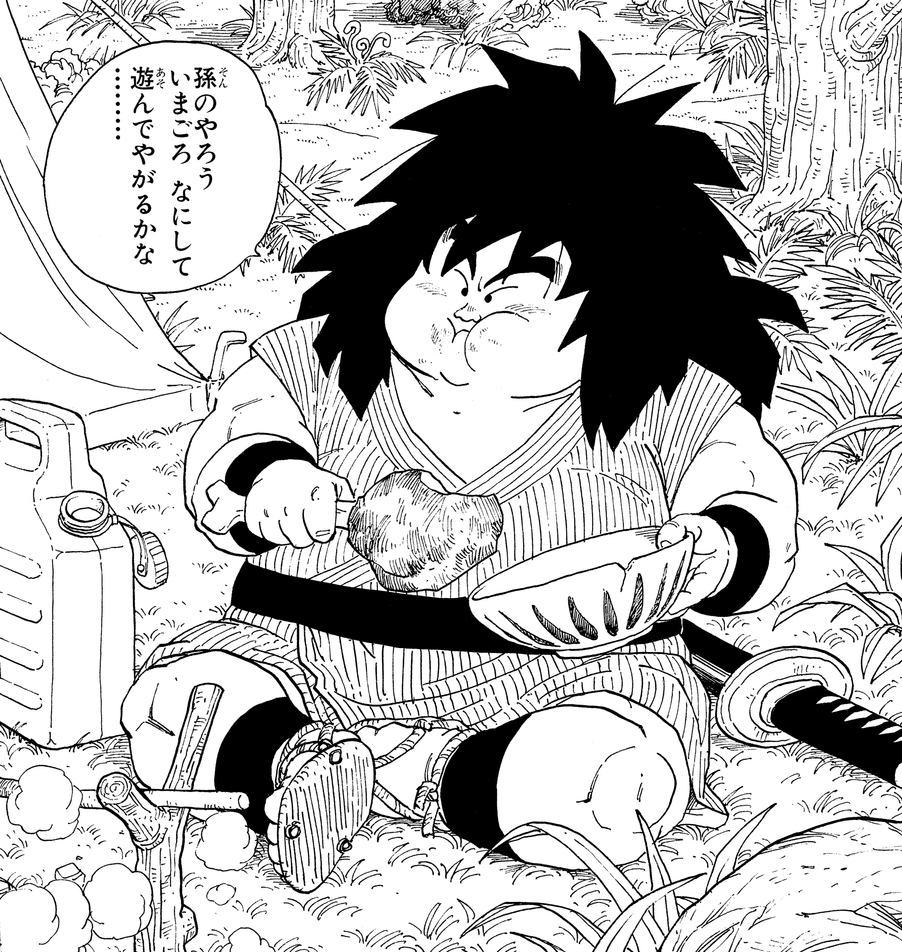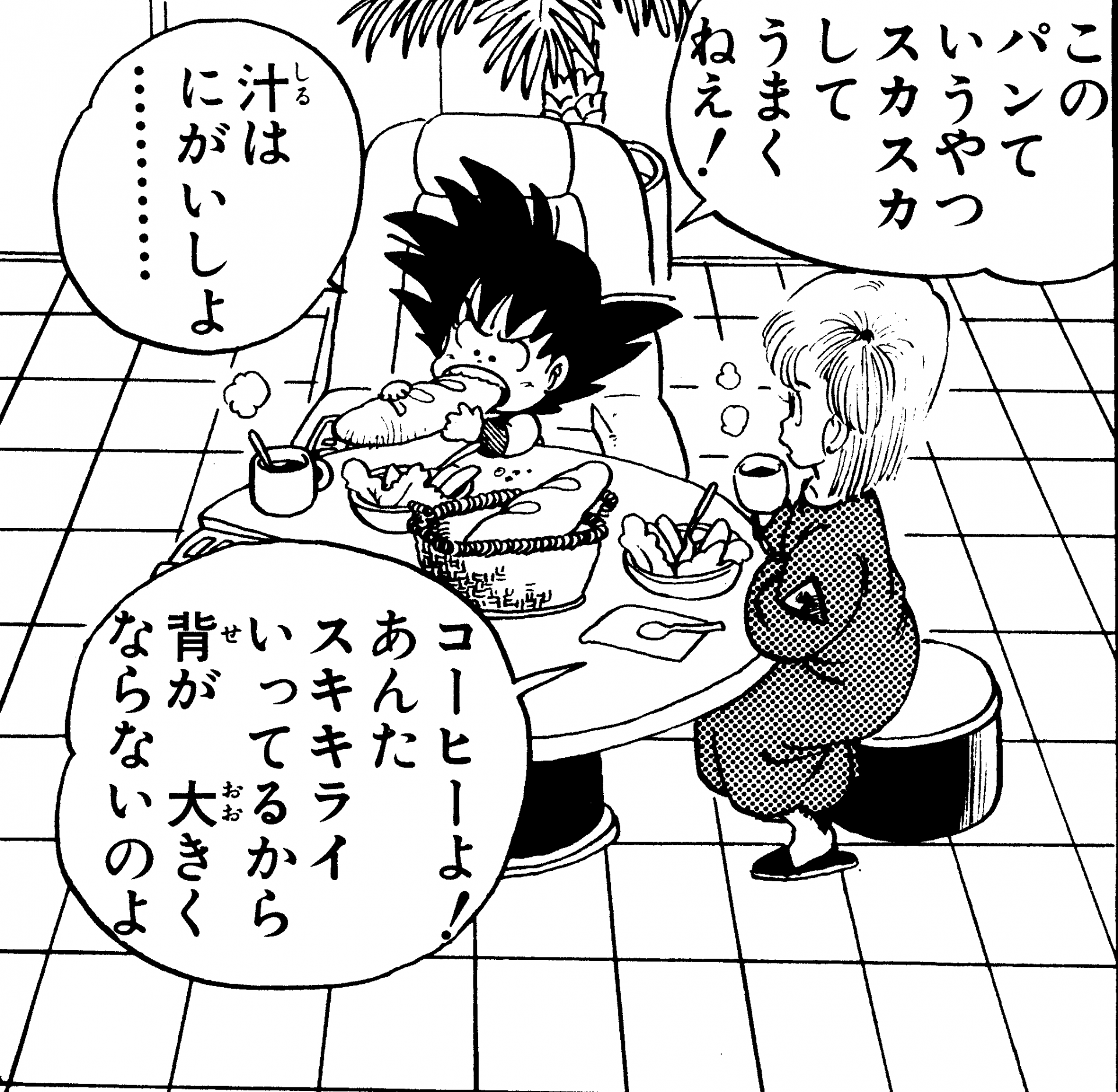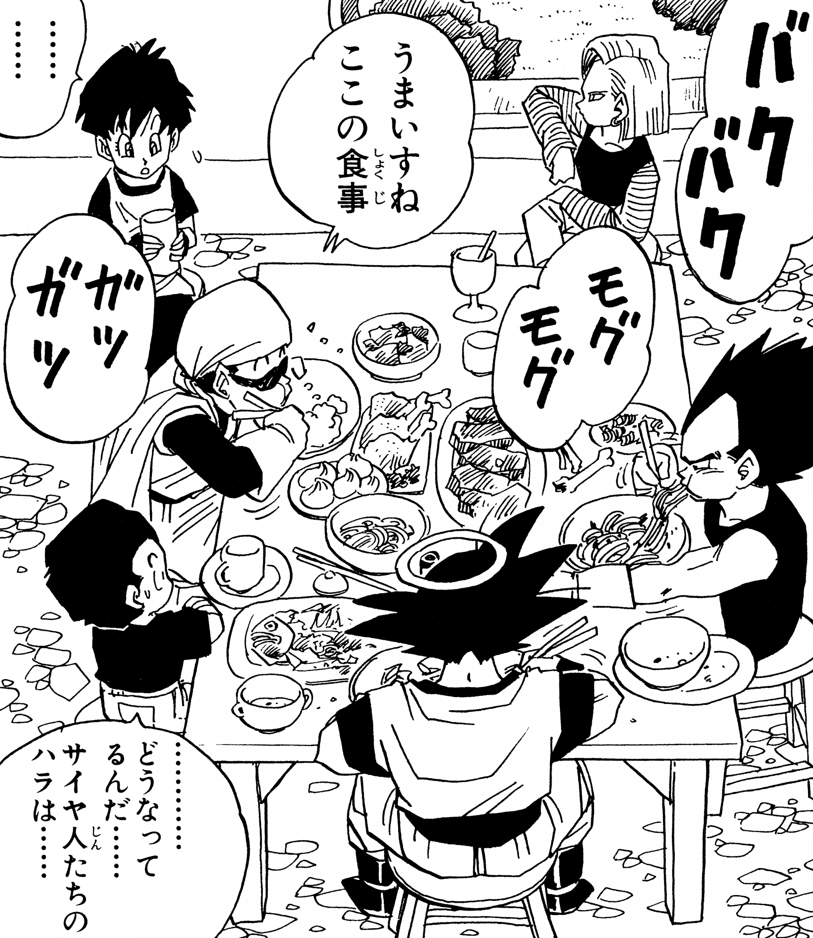 Une chose pour laquelle Dragon Ball est célèbre, ce sont les scènes où les personnages engloutissent délicieusement des montagnes de nourriture en une seule séance. Cela est particulièrement vrai pour les Saiyans comme Goku, Gohan et Vegeta, dont les incroyables habitudes alimentaires sont à peu près aussi différentes de celles des humains ordinaires que leur niveau de puissance le sont ! Un exemple de cela était après le 21e Tenkaichi Budokai, lorsque Goku a mangé l'équivalent de 50 personnes de nourriture dans un restaurant, accumulant une facture de 470 000 Zeni et utilisant presque la totalité du prix de Kamesennin en remportant le tournoi alors qu'il était déguisé en Jackie Chun.