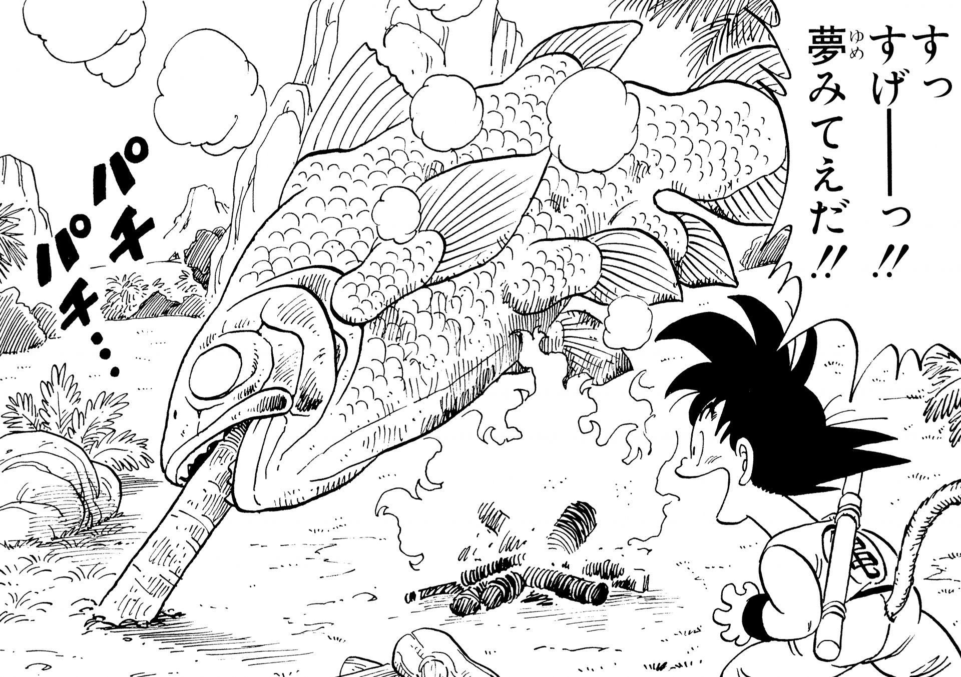La pièce maîtresse culinaire d'un repas dans Dragon Ball est la viande, la viande et encore la viande ! Des steaks de bonne taille, des cuisses et des jarrets sur l'os, et un énorme poisson sur une flamme nue ou servis dans une soupe chaude ! L'amour de la nourriture des personnages peut être vu dans la façon dont elle est préparée et présentée, et même ceux qui ont plus un goût pour la nature comme Goku et Yajirobe prépareront au moins leurs repas à la manière d'un camp avant de les écharper.