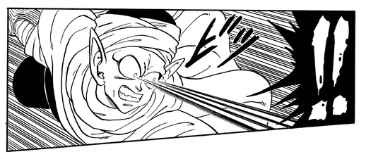 Piccolo ouvre grand la bouche et tire un puissant rayon de Ki sur son adversaire. Nous l'avons vu utiliser ce mouvement contre Goku après s'être forcé à sortir du seuil de la mort.