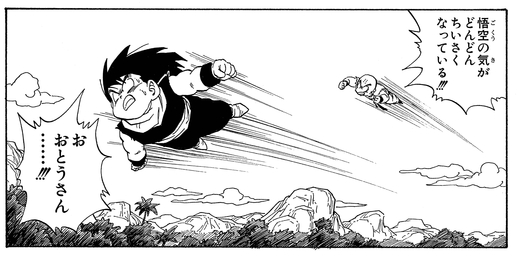 Goku a demandé à Gohan de retourner à Kame House où il serait en sécurité, mais sentant que son père était sur ses dernières jambes contre Vegeta, Gohan a résolument décidé d'aller à la rescousse de Goku et d'affronter Vegeta lui-même.