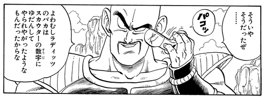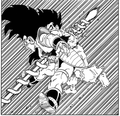 En recherchant le signal de Power Level de Goku à l'aide de son fidèle Scouter, Raditz rencontre Piccolo. Il prend un coup direct de l'une des vagues explosives ordinairement mortelles de Piccolo, mais est imperturbable et indemne, semant la peur dans le cœur du Namekian.
