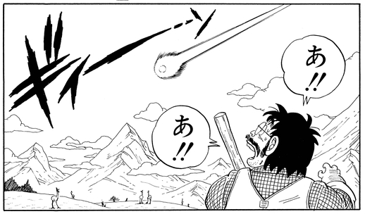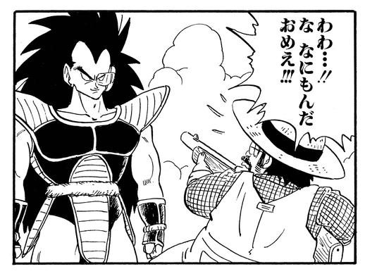Pensant que ce doit être une météorite, ou peut-être même un OVNI, il va enquêter. Mais lorsque la silhouette imposante de Raditz apparaît devant lui, il panique et brandit son arme avec frénésie pour tenter d'intimider le mystérieux envahisseur.