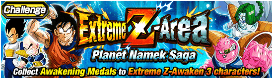"Extreme Z-Area Planet Namek Saga" est lancé ! C'est un événement que vous ne pouvez tenter qu'avec certains personnages de votre groupe, mais si vous revendiquez la victoire dans les batailles extrêmes qui vous attendent, vous obtiendrez des médailles d'éveil en récompense ! Extreme Z-Awaken les personnages de la catégorie «Planet Namek Saga » applicables pour renforcer leurs compétences de leader, leurs compétences passives et leurs super attaques !