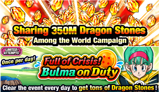La campagne "Partager 350 millions de pierres de dragon dans le monde" est également en cours, alors continuez à terminer "Plein de crise ! Bulma en service" et obtenez vos 10 pierres de dragon tous les jours !