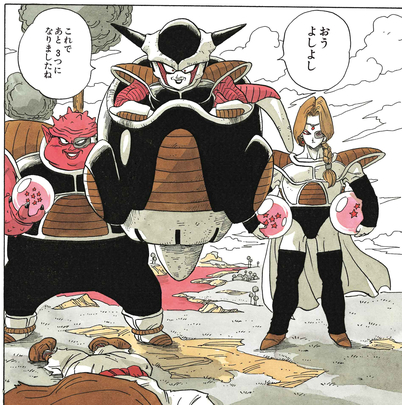 Invoquant la Force Ginyu pour lui venir en aide, Frieza réussit de manière spectaculaire à assembler les sept Dragon Balls. Il fait tout ce qui est en son pouvoir pour forcer le guerrier Namekian Nail à révéler comment utiliser les Dragon Balls, mais les fait voler sous son nez par Krillin et les autres, qui les utilisent pour que leur vœu soit exaucé avant que Frieza n'en ait jamais l'occasion. !