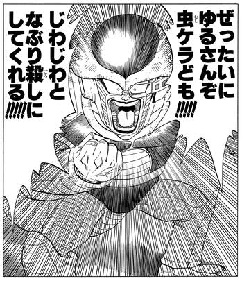 Réalisant que son offre pour la vie éternelle avait été contrecarrée par Vegeta et les autres, la rage de Freezer explose et il se lance dans la bataille avec une fureur aveuglante.