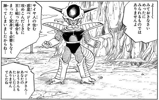 Malgré sa capacité à se transformer et à se mettre sous tension, la First Form de Freezer était suffisamment puissante pour dévaster le père de Vegeta, le roi des Saiyans.