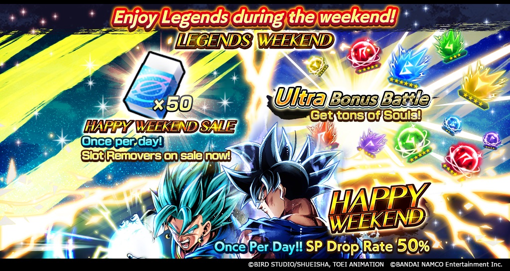 De plus, avec l'invocation « HAPPY WEEKEND » vous donnant 50 % de chance de marquer un personnage SPARKING une fois par jour, ce n'est pas un événement que vous pouvez vous permettre de manquer ! Jouez à cette invocation exclusive LEGENDS WEEK-END et vous aurez même une chance de vous emballer vous-même l'un des personnages de LEGENDS LIMITED de la composition !