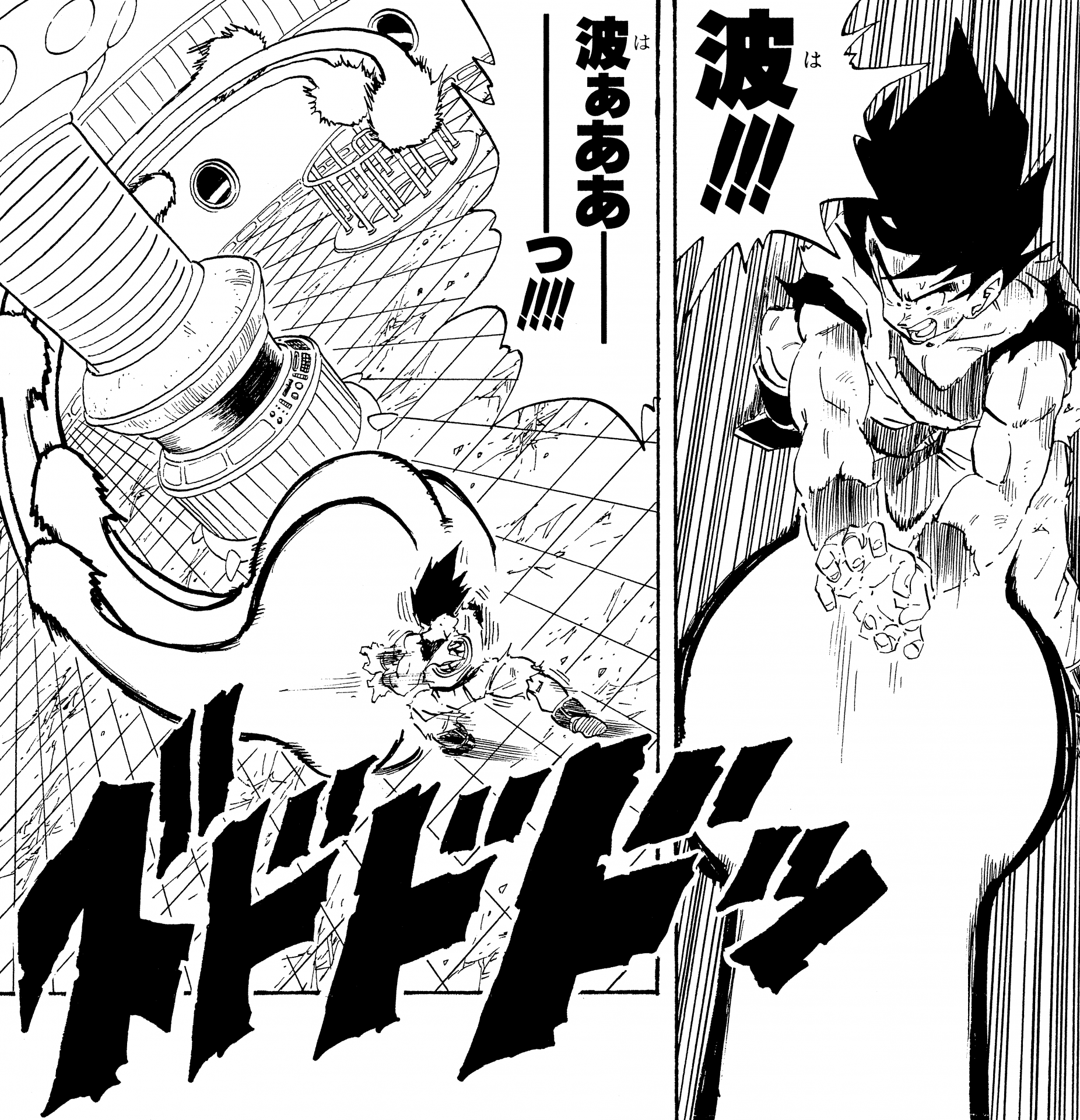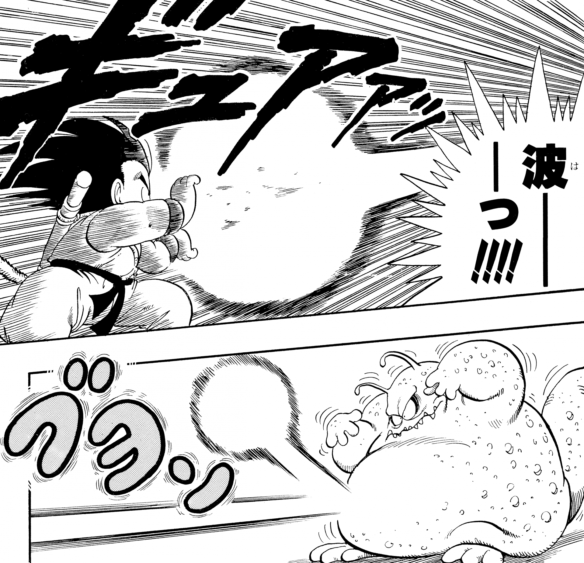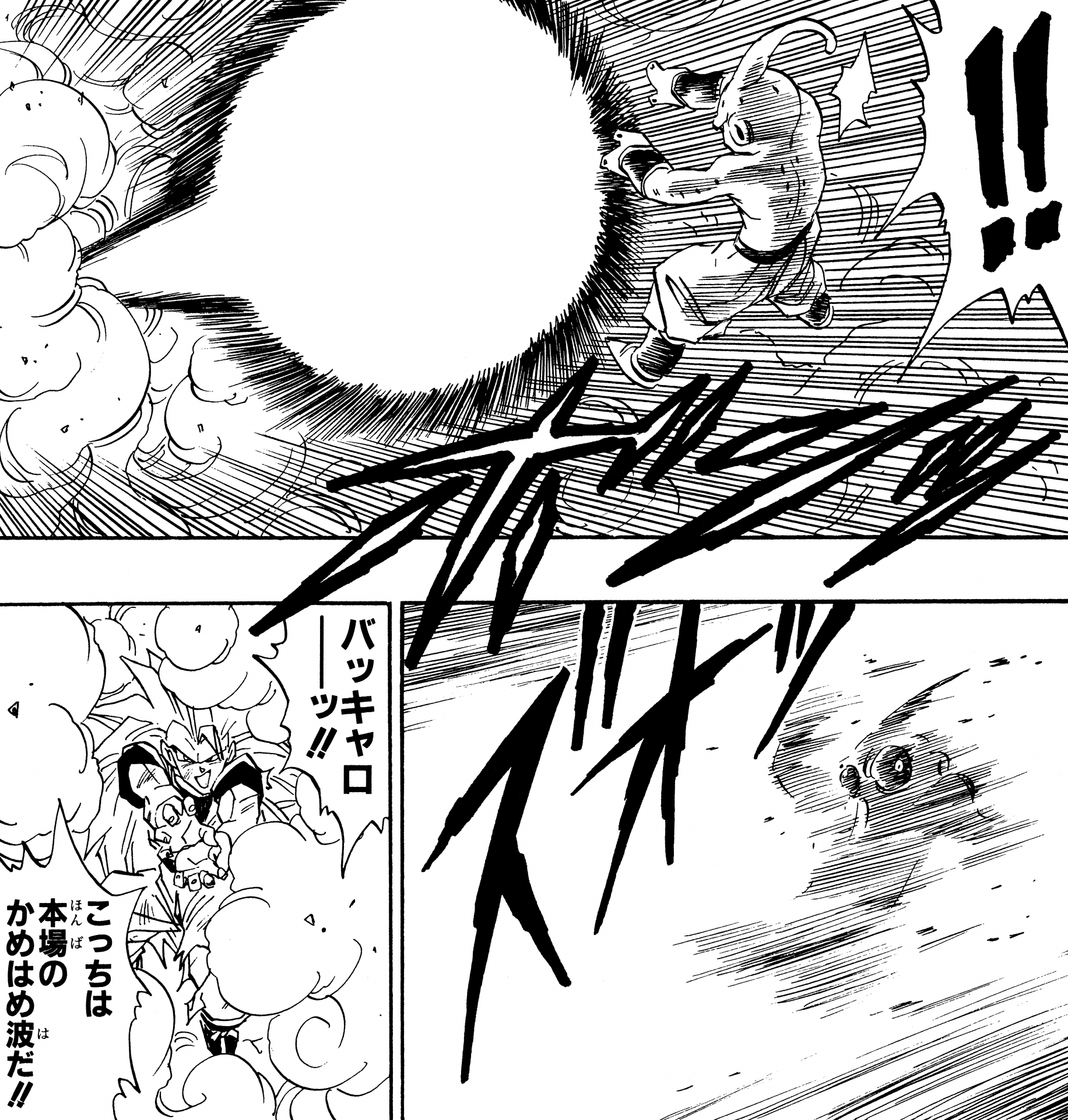 ・Conte 475, page 5 : Buu tire sur Goku. Note qu'ici, Buu est devenu capable de tirer un Kamehameha après avoir vu Goku exécuter la technique et copier ses mouvements.