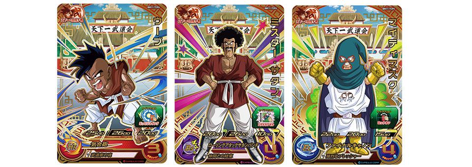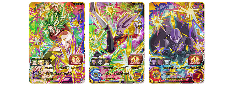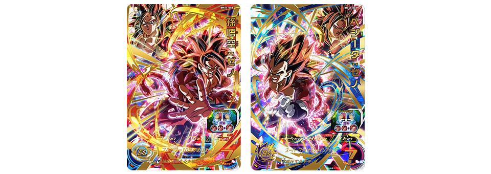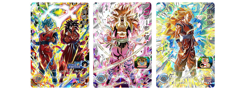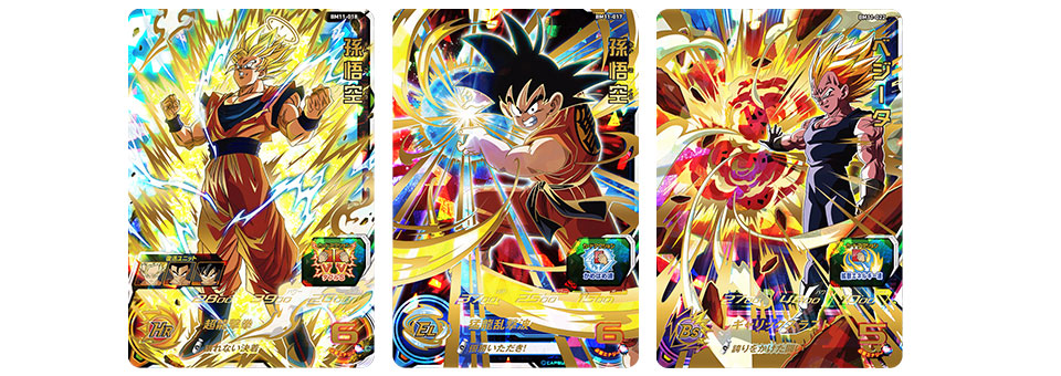 Pour les cartes de la série originale, nous avons Vegeta "Prince of Destruction ", Angel Halo Super Saiyan 2 Goku, et faisant sa première apparition dans Super Dragon Ball Heroes, Kame School Uniform Goku !