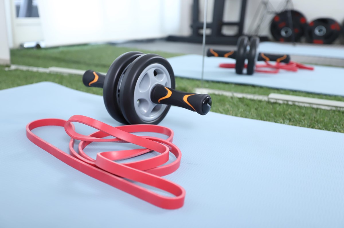 En utilisant des équipements d'entraînement, vos entraînements deviennent plus efficaces. Nous utiliserons deux pièces d'équipement qui sont à la fois facilement disponibles à commander en ligne, relativement pas cher et faciles à stocker à la maison : une bande de résistance et une roue ab.