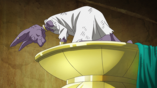 →Aperçu :Le personnage de la semaine prochaine baisse la tête si profondément devant Beerus qu'il est pratiquement au sol !