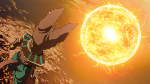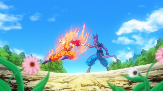 Sa confrontation suivante avec Goku sous la forme de Super Saiyan God s'intensifie à une vitesse vertigineuse, culminant avec Beerus déclenchant une attaque suffisamment puissante pour anéantir toute la Terre. Heureusement pour nous Terriens, Goku dévoile un pouvoir sans précédent et parvient à annuler l'attaque cataclysmique.