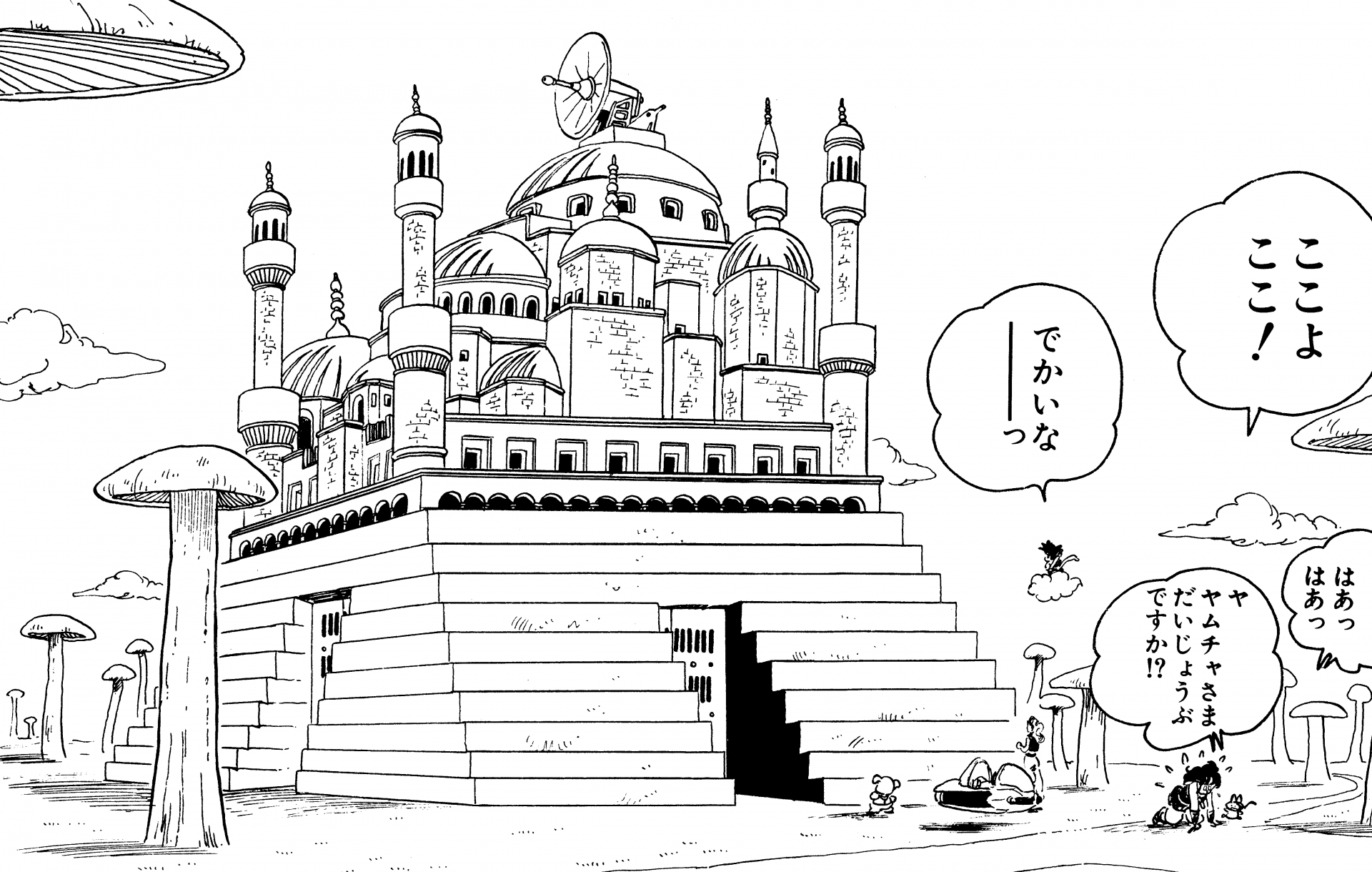 Ce château est le siège du Pilaf Gang, un trio ignoble qui a comploté pour conquérir le monde en utilisant le pouvoir des Dragon Balls. Le paysage clairsemé et paisible de gigantesques champignons ressemblant à des arbres entourant le château contraste fortement avec son intérieur traître. Parmi les installations sinistres de la forteresse, il y a un labyrinthe piégé dans lequel les intrus désespérés se perdent et des prisons pour les garder à l'intérieur qui servent également de chambres d'exécution pour les éliminer, le tout sous l'œil vigilant de Pilaf depuis sa salle de commandement via des caméras de surveillance. . Mais tout n'est pas catastrophique, pas pour le Pilaf Gang, bien sûr ! Les quartiers d'habitation du château sont bien équipés pour Pilaf, Shu et Mai, qui ont chacun leur propre chambre et même une salle de jeux commune avec une table de ping-pong et un flipper, ce qui en fait un répit confortable tout en ne enchérir pour la domination du monde.