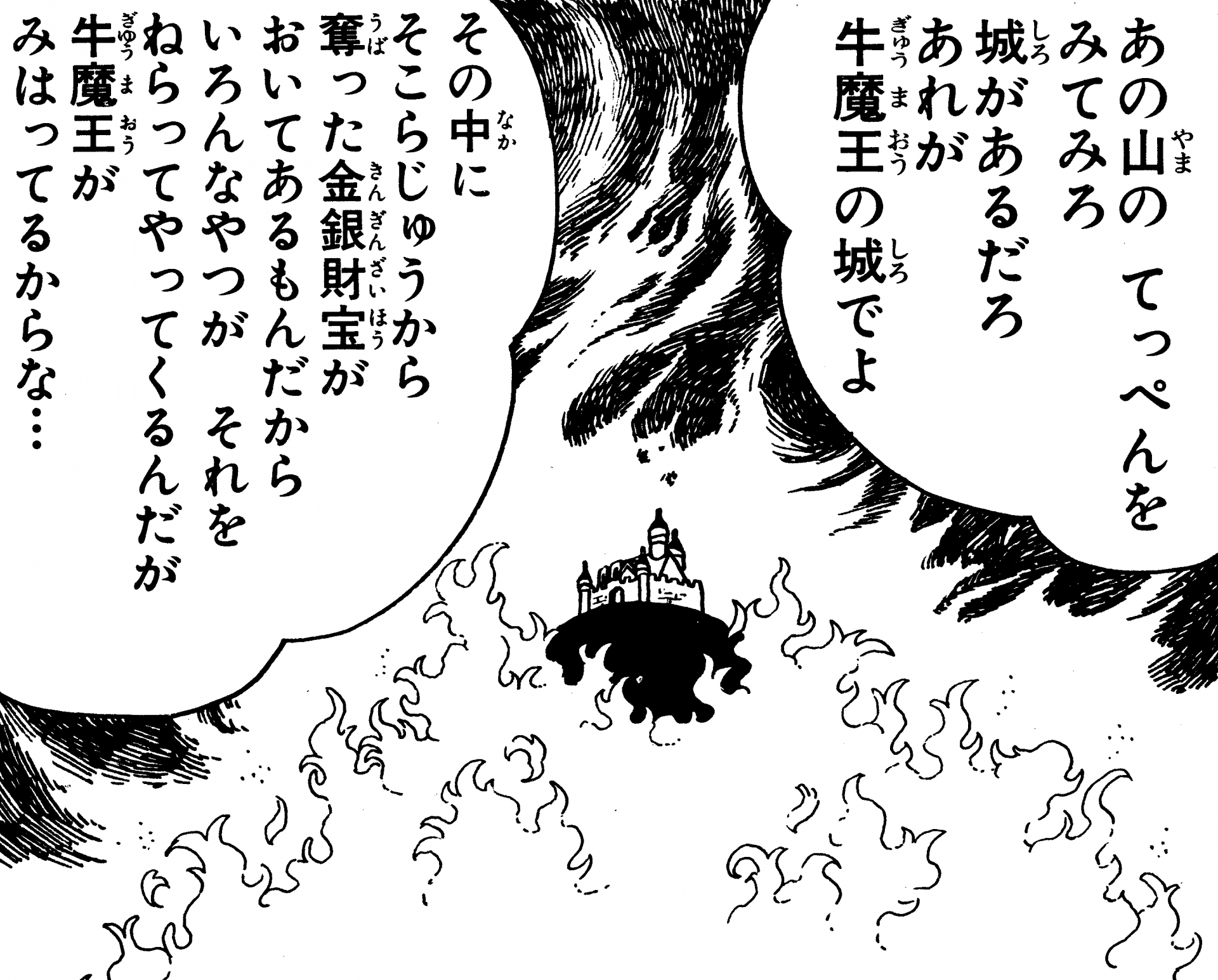 Cette montagne brûlante est enveloppée par un feu perpétuellement ardent. Au sommet du sommet de la montagne se trouve le château de Gyumao, mais il a été longtemps incapable de rentrer chez lui en raison des flammes intenses qui ont englouti la région.