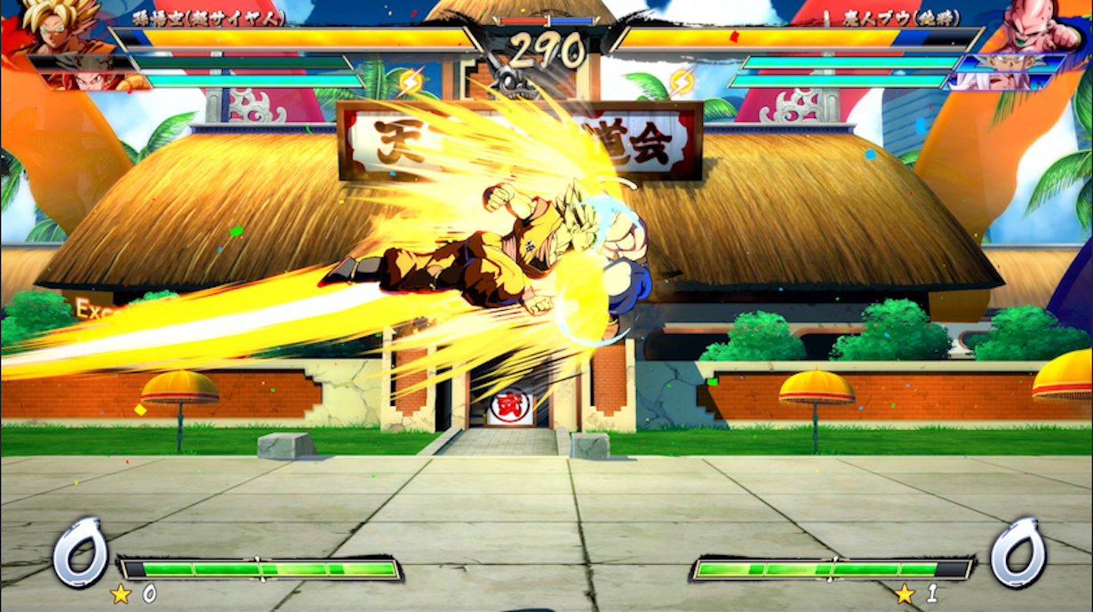 Comme je suis sûr que vous pouvez le deviner, je joue en tant que Goku (barre de santé de gauche) et GO1 est Majin Buu (barre de santé de droite). Ouais, j'ai pris une raclée absolue...