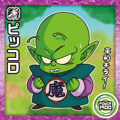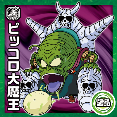 Cette grande figure est le Great Demon King Piccolo avant son rajeunissement de jeunesse par le pouvoir des Dragon Balls ! Il n'est apparu qu'une seule fois auparavant dans la toute première série de Gaufrettes et stickers Super Guerrier, mais après une interruption de six ans, le roi démon est enfin revenu sous les feux de la rampe, pondant l'œuf de l'un de ses sous-fifres pour cette nouvelle entrée.