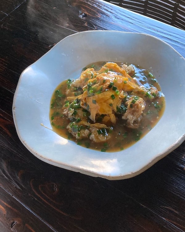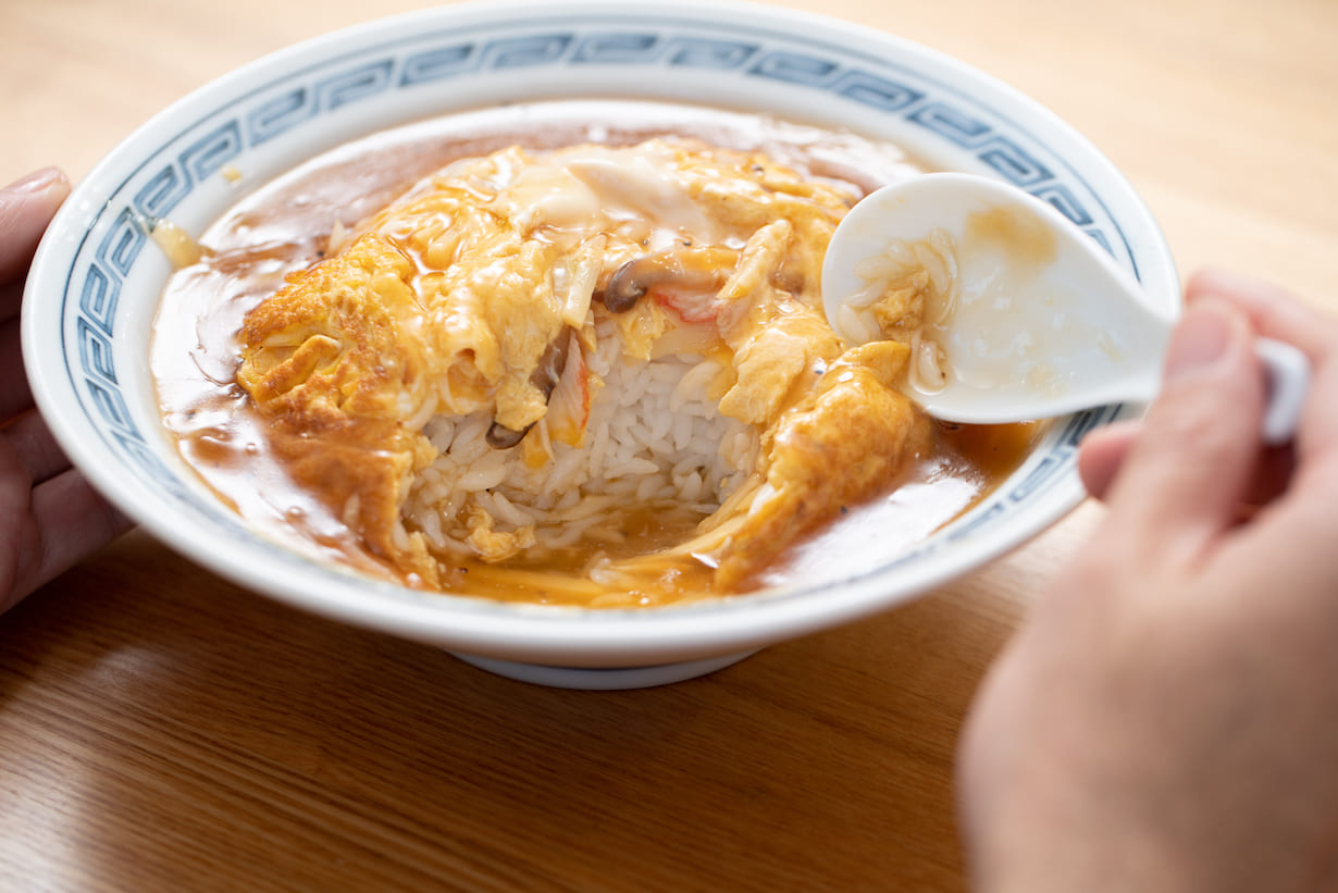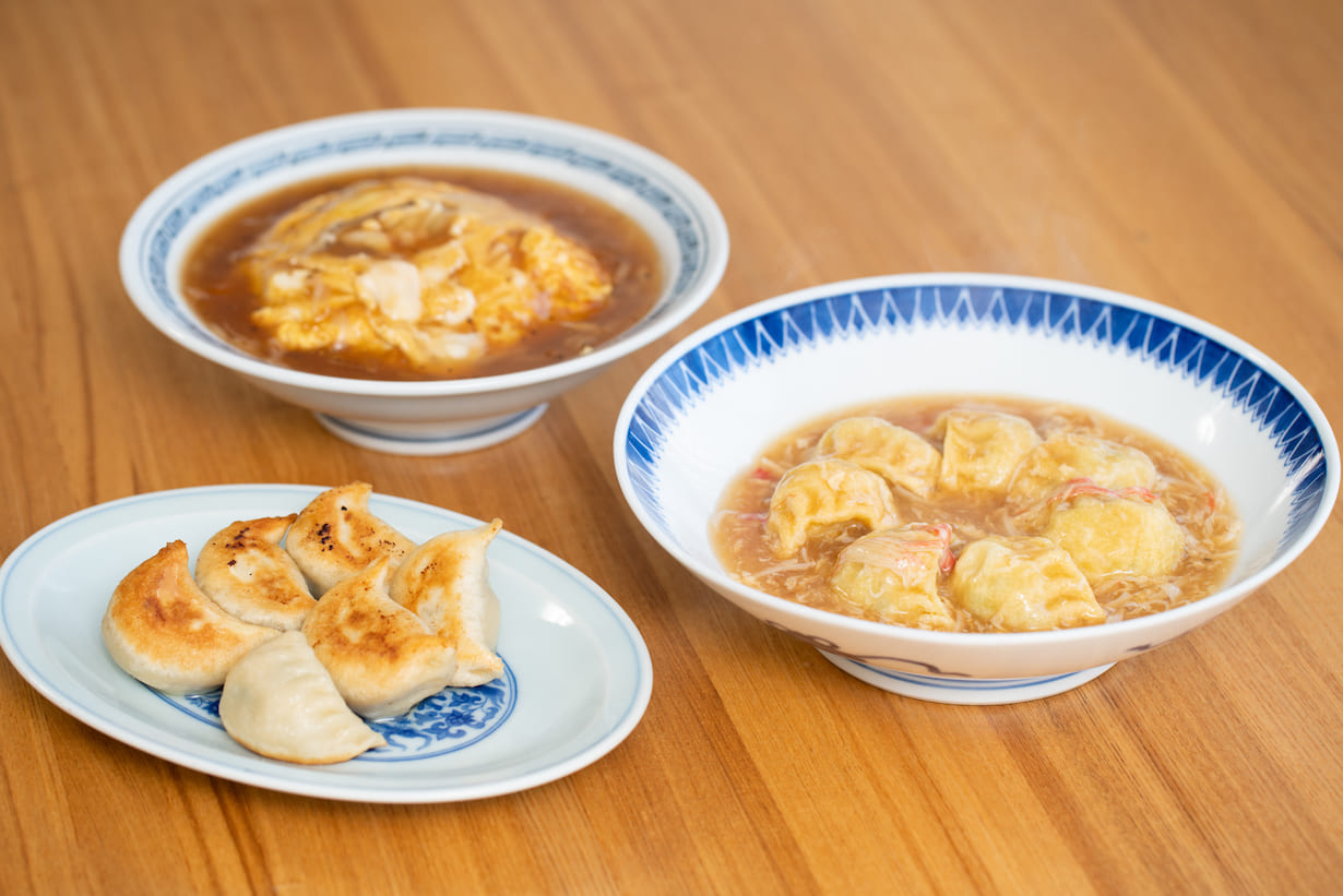 Tsurusenhan seraun type spécial de jiaozi qui a été amélioré avec des éléments de tenshinhan.Plus précisément, j'ai essayé de recréer la façon d'envelopper le riz dans une omelette pour le tenshinhan en utilisant la pâte de boulette de jiaozi.