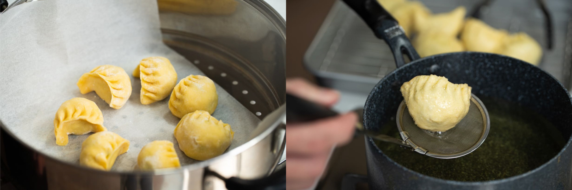 Et si ils n'étaient que vapeur, les poches seraient lisse et glissantes, ce qui rendrait difficile pour la garniture de coller. Mais en les faisant légèrement frire, ajoutant ainsi un peu de rugosité à leur surface, la garniture est capable de les enrober parfaitement.