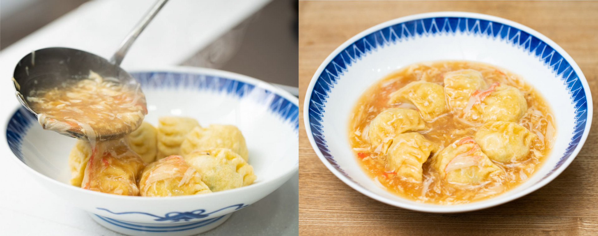 À gauche : jiaozi normal. À droite : Tsurusenhan.