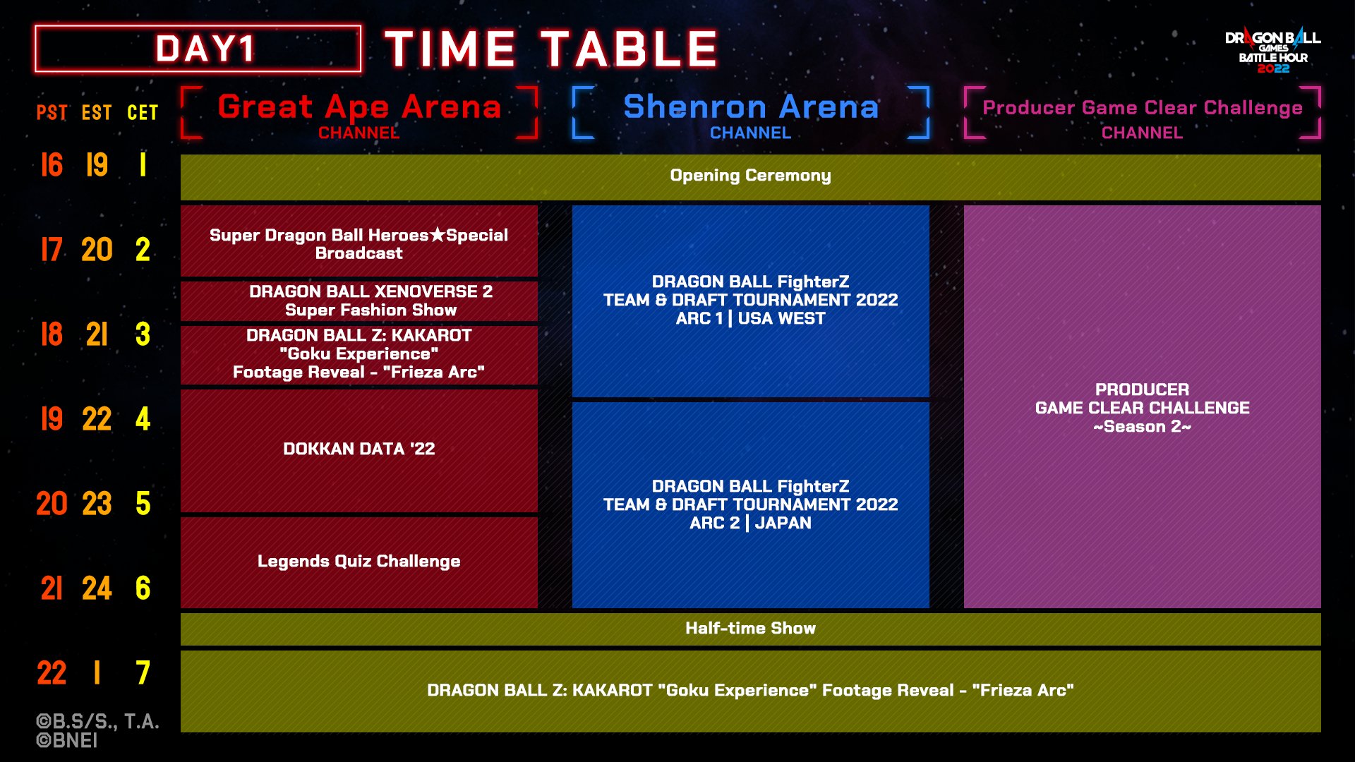 L'événement sera réparti sur trois chaînes diffusées en même temps, chacune avec son propre contenu. La chaîne Great Ape Arena proposera des tonnes d'événements spéciaux, y compris le "Super Dragon Ball Heroes Special God Team Showdown 2022", des quiz auxquels les téléspectateurs peuvent participer, et bien plus encore ! La chaîne Shenron Arena accueillera des combats intenses dans FighterZ dans toutes les régions ! Et sur la chaîne Producer Game Clear Challenge, des producteurs de toute l'histoire des jeux Dragon Ball se réuniront pour s'attaquer au jeu PS2 classique «Dragon Ball Z: Budokai 2 » !
