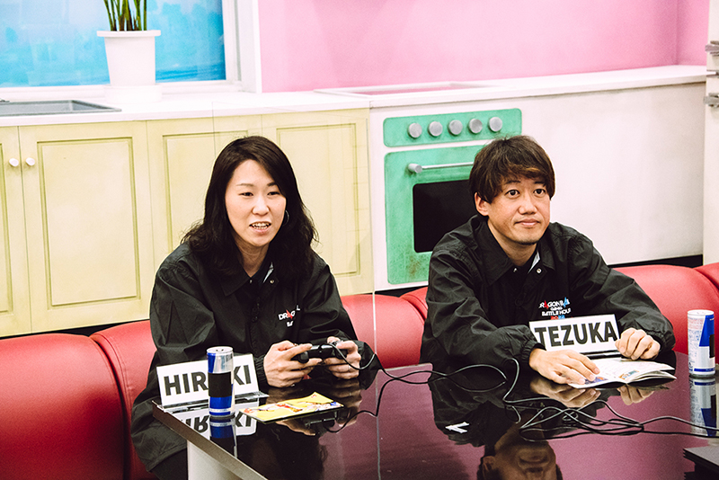 Hirano (à gauche) et la productrice Hara (à droite), qui ont travaillé ensemble sur les mêmes titres par le passé. Selon Hirano, "le producteur Hara se dédie à la création de jeux, et il apprécie particulièrement les grands jeux, à tel point qu'il a même apporté une console à l hôtel pour faire un plus de jeux avant de venir sur la salle. »