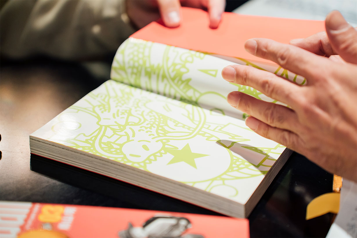 Shimada : Donc, 2002 était l'année où la Coupe du monde de la FIFA s'est tenue au Japon et en Corée. Je regardais l'équipe coréenne jouer à la télévision, et lorsque la caméra a fait un panoramique sur les spectateurs dans le public, c'était cette vaste mer de rouge vif de tous les maillots qu'ils portaient . Cette scène de passion et d'enthousiasme débordants a eu une réelle impression sur moi. Je me suis dit que ça aurait aussi l'air vraiment cool si au lieu de spectateurs en maillot, c'était une mer de couvertures de mangas rouges qui remplissaient les étagères d'une librairie, alors j'ai commencé à concevoir des brouillons comme ça.