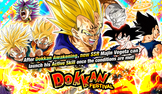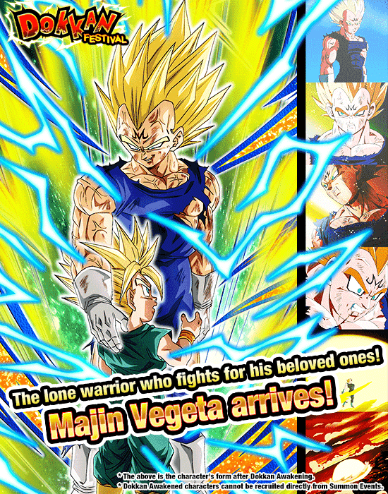 *Le personnage illustré ci-dessus est la forme d'éveil Dokkan de [A Lonely Battle] Majin Vegeta, qui est disponible via l'invocation du Festival Dokkan.