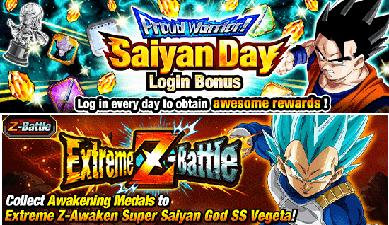 Obtenez un fond d'écran spécial dessiné par Toyotarou lui-même avec votre première connexion pendant la période "Proud Warrior! Saiyan Day Login Bonus" !! De plus, un nouveau Extreme Z-Battle arrive où vous pourrez Extreme Z-Awaken [Observance of Pride] Super Saiyan God SS Vegeta! Assurez-vous de vous connecter à Dokkan Battle et profitez des festivités du Saiyan Day pendant qu'elles durent !