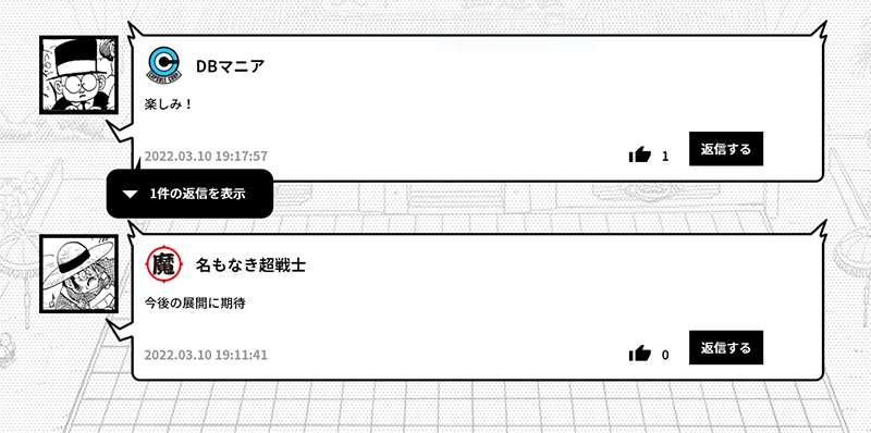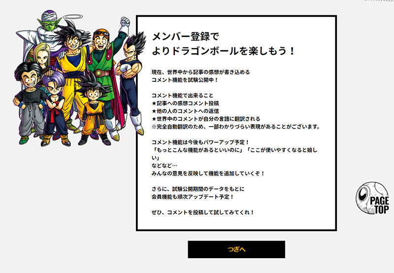 Les commentaires rédigés par des fans du monde entier peuvent être traduits en japonais, anglais, français, allemand et espagnol (selon la langue du site) à l'aide de la fonction de traduction intégrée de la section des commentaires ! Essayez-leet parlez Dragon Ball avec des fans de différents pays !