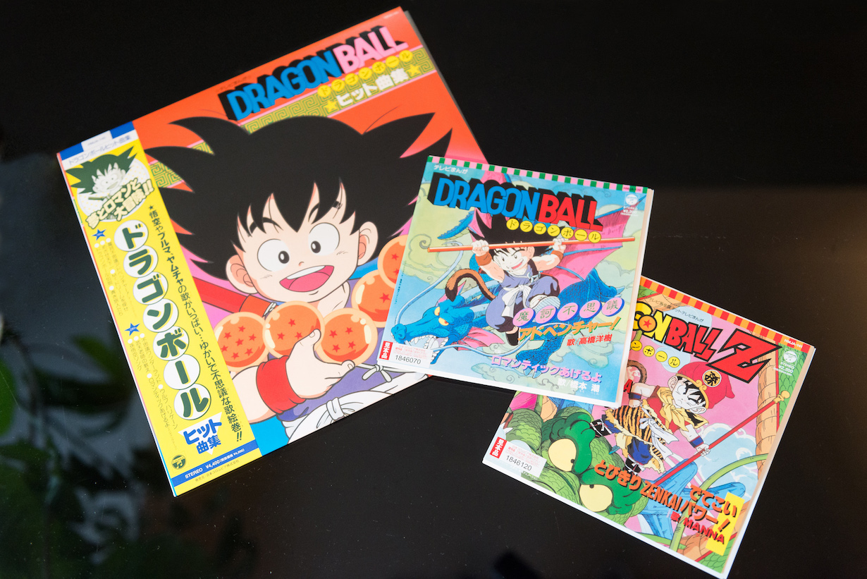À partir de la gauche:"Collection de chansons à Hit Dragon Ball " PL,"Aventure Makafushigi!" (disque vinyle 7 pouces),